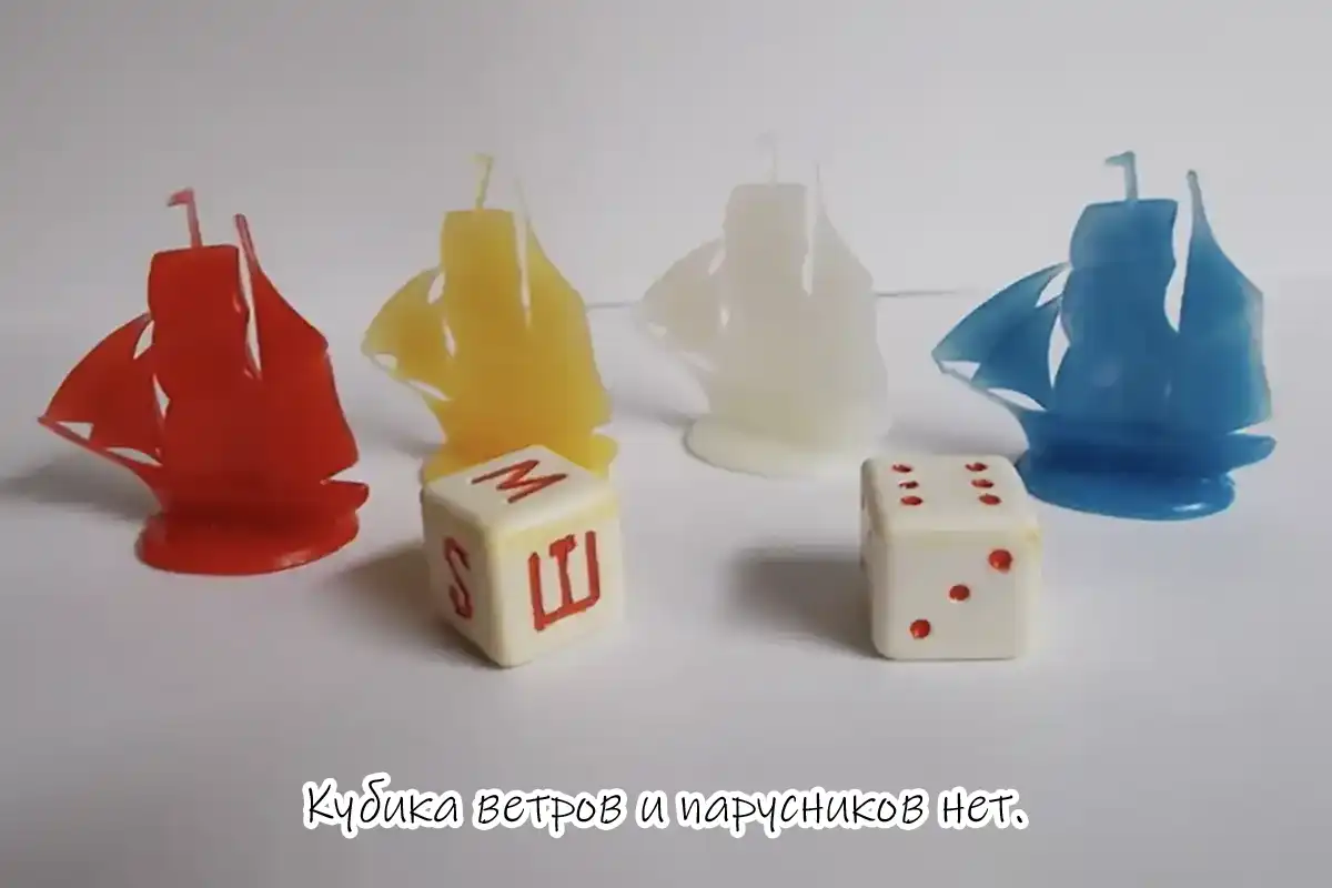 В оригинальной комплектации игра имела уникальные фишки в виде парусников и специальный кубик ветров, который делал морское путешествие особенно реалистичным. Вместо обычных цифр кубик ветров показывал направления ветра, что добавляло игре непредсказуемости и отражало реальные условия мореплавания. Хотя в нашей версии используются стандартные разноцветные фишки и обычный кубик, это нисколько не уменьшает увлекательность игры.