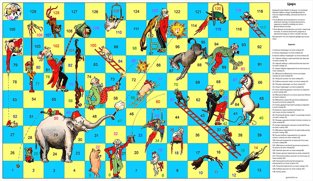 Это не просто игра-ходилка — это захватывающее путешествие, где удача то поднимает вас вверх по лестницам к быстрой победе, то неожиданно опускает вниз, заставляя преодолевать путь снова. Яркие цирковые иллюстрации с акробатами, дрессированными животными и веселыми артистами создают неповторимую атмосферу праздничного шатра. Кто первым преодолеет все препятствия, поднимется по самым высоким лестницам и достигнет финиша? Бросайте кубик и отправляйтесь в незабываемое приключение «Вверх и Вниз»!