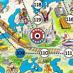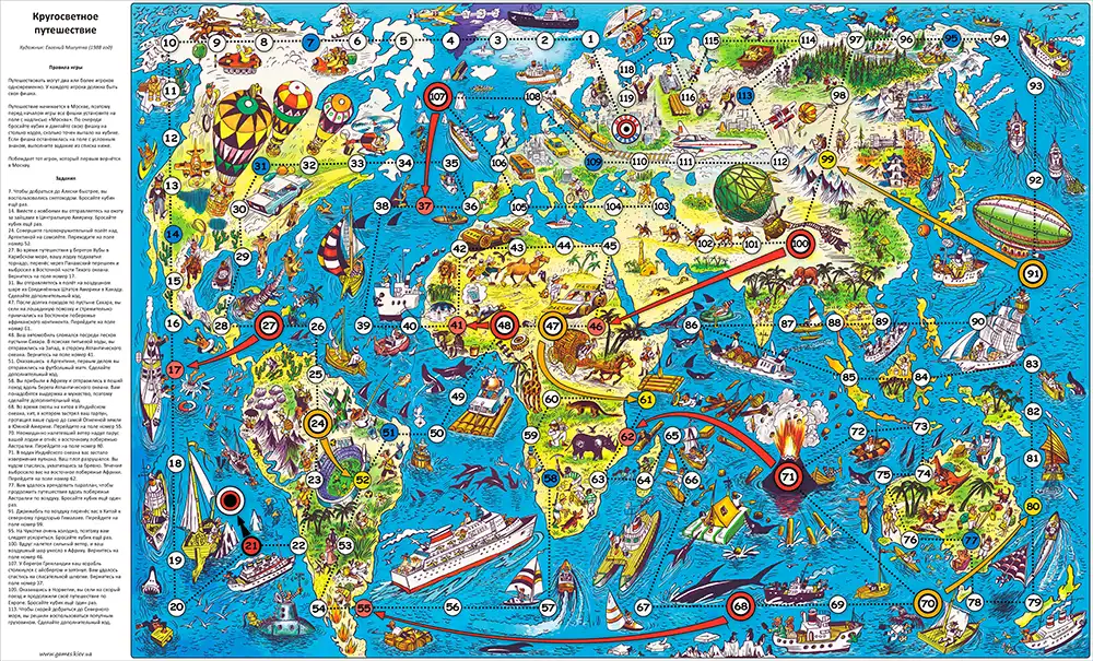 Некоторые поля позволяют продвинуться вперёд или заставляют вернуться назад, что добавляет азарт и непредсказуемость. Побеждает тот, кто первым завершит кругосветное путешествие!