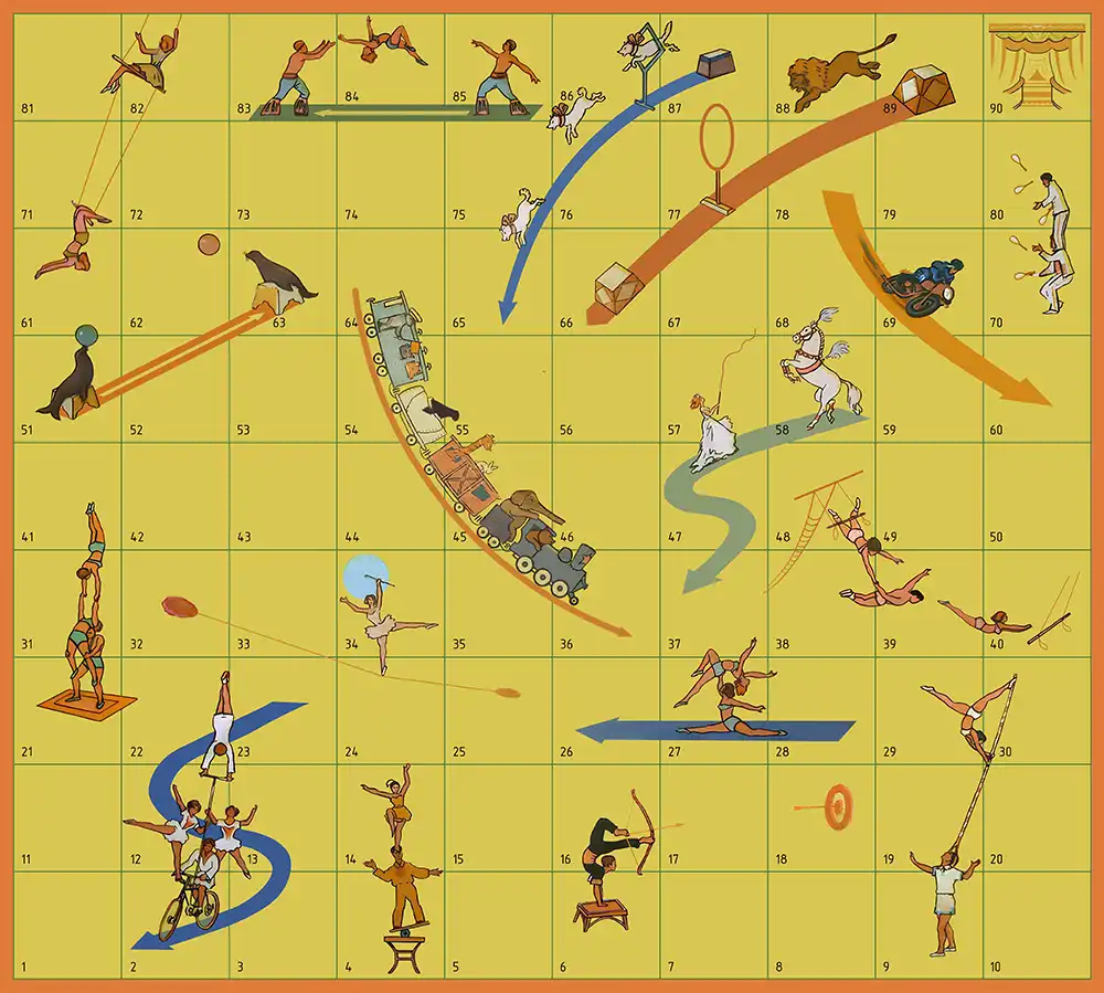 Ласкаво просимо до барвистого світу манежу! Настільна гра “Циркові ігри” – це захоплююча класична гра-ходилка, що перетворить звичайний вечір на справжнє видовище, сповнене неймовірних пригод. Уявіть собі яскраве ігрове поле, де кожна з 90 клітинок – це нова несподіванка в світі циркового мистецтва. Дресировані слони, спритні акробати, веселі клоуни та екзотичні звірі чекають на ваших малюків, щоб провести їх крізь лабіринти циркових атракціонів. Це не просто гра – це квиток у світ магії, де кожен кидок кубика визначає долю маленького мандрівника по барвистому манежу!