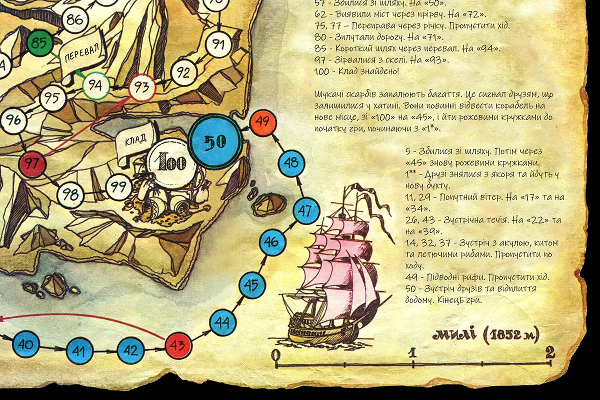 Якщо вам потрібна гра російською, англійською чи будь-якою іншою мовою – це не проблема. Просто зазначте бажану мову у коментарі до замовлення або повідомте нашого менеджера під час оформлення покупки. Ми з радістю надрукуємо «Острів скарбів» мовою, яка буде найзручнішою для ваших маленьких піратів!